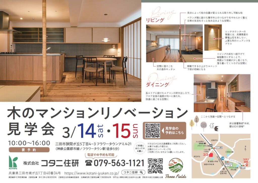 ご予約はホームページの新着情報【予約開始!三田市「木のマンションリノベーション」見学会|一般公開】